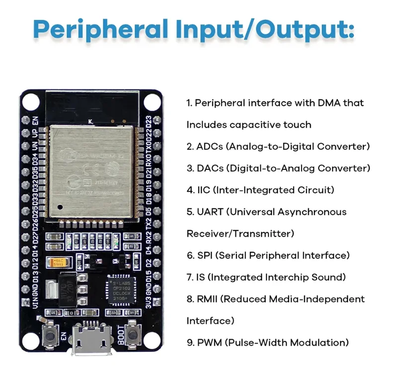 Placa de desarrollo ESP32-S: microcontrolador dual-core de 240 MHz con Wi-Fi y Bluetooth integrados, 4 MB de Flash, 520 KB de SRAM y múltiples pines GPIO.